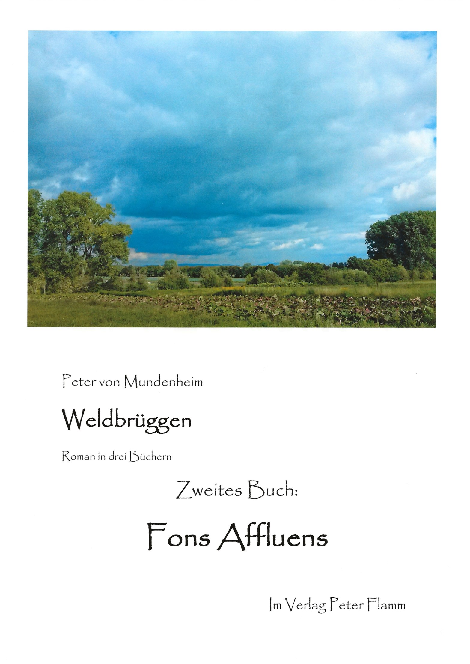 Weldbrüggen: Roman in drei Büchern. Zweites Buch: Fons Affluens. Schauernheim: Verlag Peter Flamm, 2. Auflage in drei Bänden, 2025 (1. Auflage in einem Band 2023). Kindle eBook: ISBN 978-3-946660-20-0, Paperback: ISBN 978-3-946660-21-7. Druckausgabe 484 Seiten. Erhältlich bei amazon und im Buchhandel.